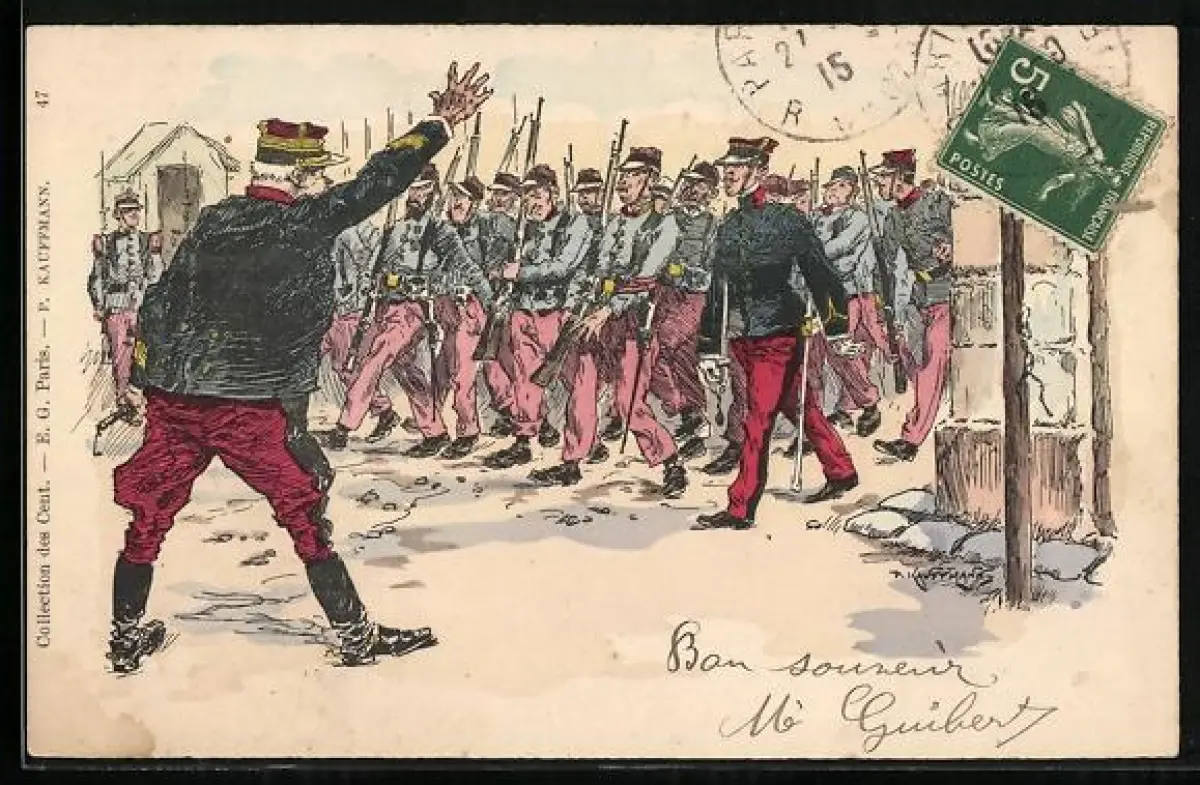 Künstler-AK Hans Kaufmann: Offizier hält schief marschierende Soldaten auf