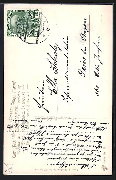 Personenbezogene Daten auf der Rückseite der Karte wurden durch blauen Textmarker unkenntlich gemacht. Die blauen Stellen sind auf die Vorderseite durchgeweicht und wirken sich negativ auf das Postkartenfoto aus