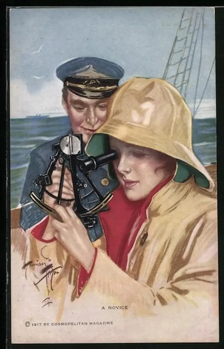 Künstler-AK Harrison Fisher: A Novice, Frau wird in den Gebrauch des Sextanten eingewiesen
