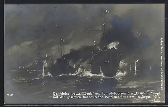 Künstler-AK Harry Heusser: Kriegsschiffe Zenta und Ulan im Kampf m. d. gesamten franz. Mittelmeerflotte 16.8.1914