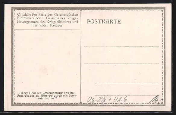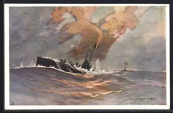 Künstler-AK Harry Heusser: Vernichtung des ital. U-Boots Nereide durch österr. U-Boot