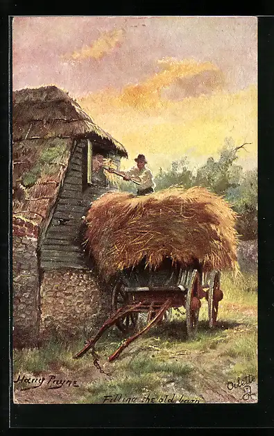 Künstler-AK Harry Payne: Bauer schaufelt das Heu auf den Dachboden