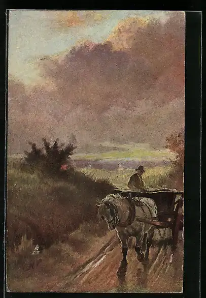 Künstler-AK Harry Payne: Mann mit Pferdefuhrwerk auf dem Weg nach Hause