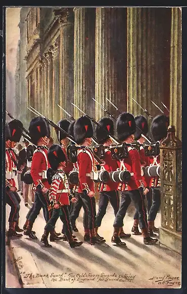 Künstler-AK Harry Payne: The Bank Guard, The Coldstream Guards entering the Bank of England for Guard duties