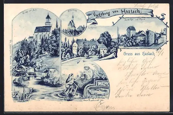 Künstler-AK Haslach, Kirche & Bad, Hollerberg, Lichtenau, Markt-Thor & Thurm