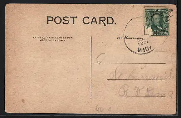 Personenbezogene Daten auf der Rückseite der Karte wurden durch blauen Textmarker unkenntlich gemacht. Die blauen Stellen sind auf die Vorderseite durchgeweicht und wirken sich negativ auf das Postkartenfoto aus