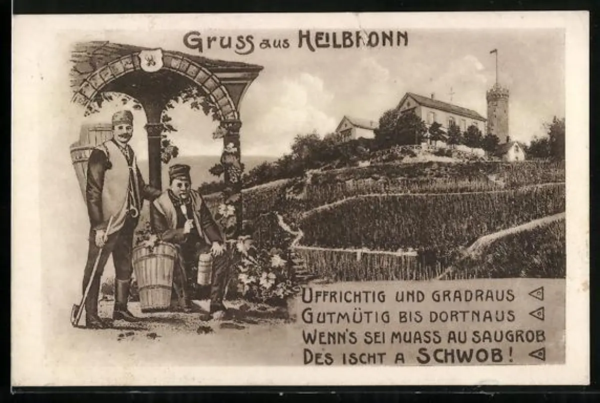 Künstler-AK Heilbronn, Weinberg mit Kelterern und Aussicht auf Turm