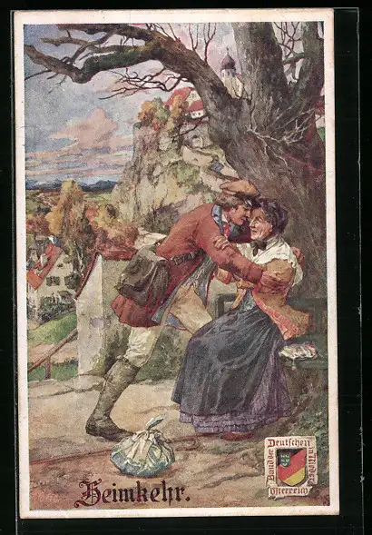 Künstler-AK Heimkehr, Soldat umarmt seine Grossmutter