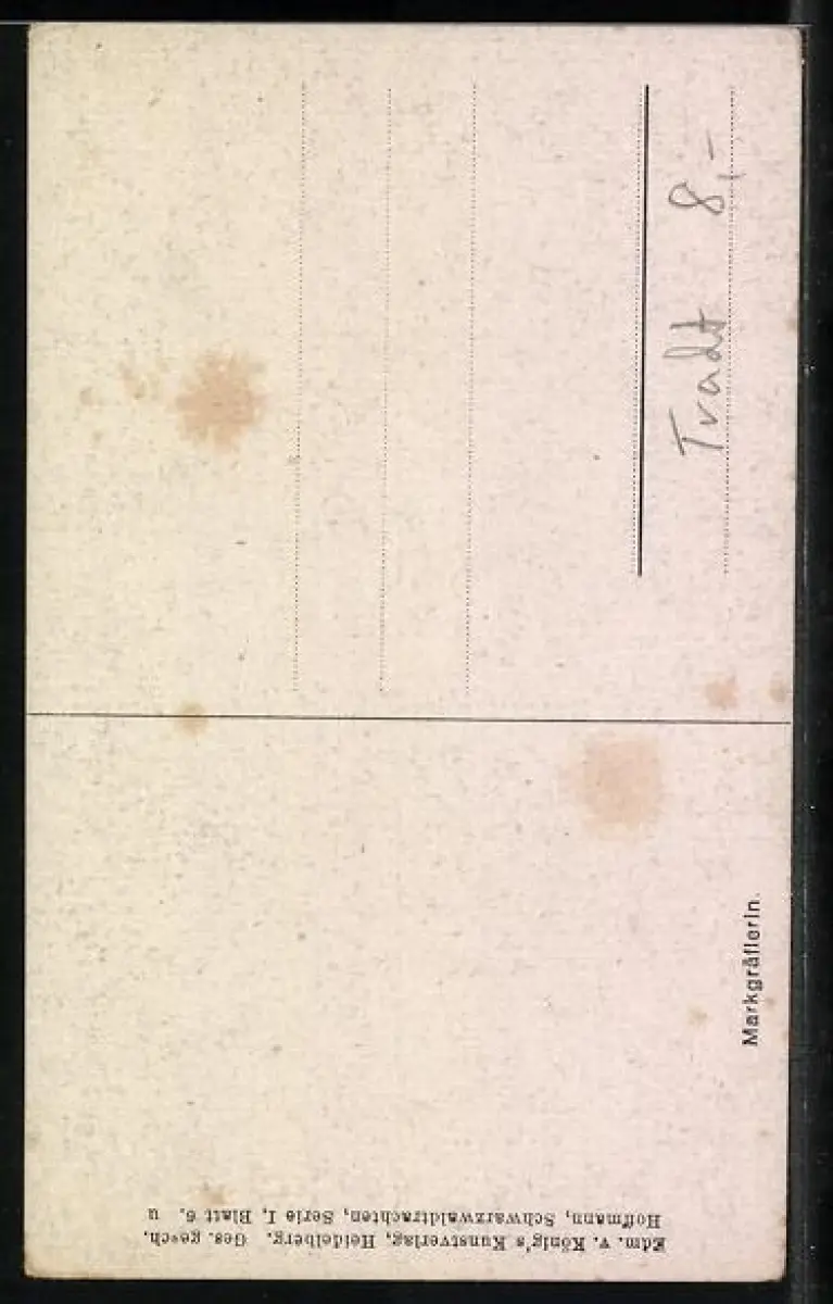 Personenbezogene Daten auf der Rückseite der Karte wurden durch blauen Textmarker unkenntlich gemacht. Die blauen Stellen sind auf die Vorderseite durchgeweicht und wirken sich negativ auf das Postkartenfoto aus