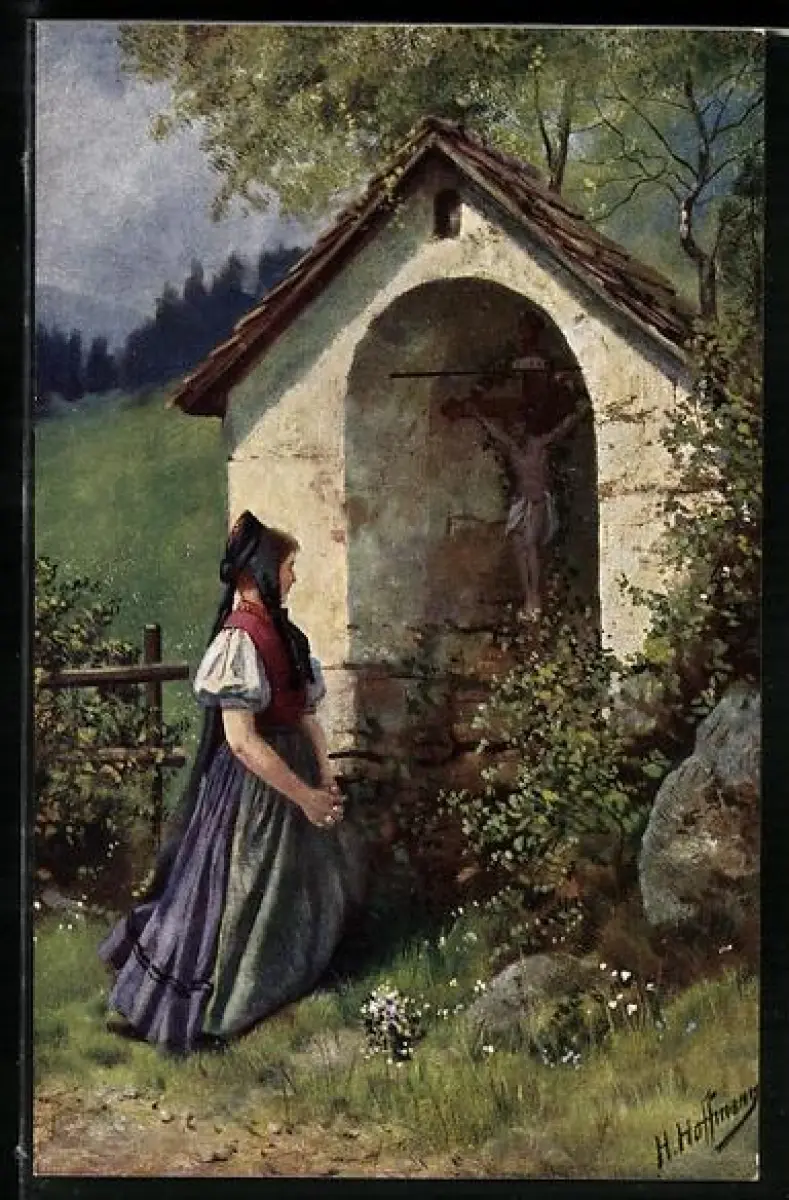 Künstler-AK Heinrich Hoffmann: junge Frau am Bildstöckl