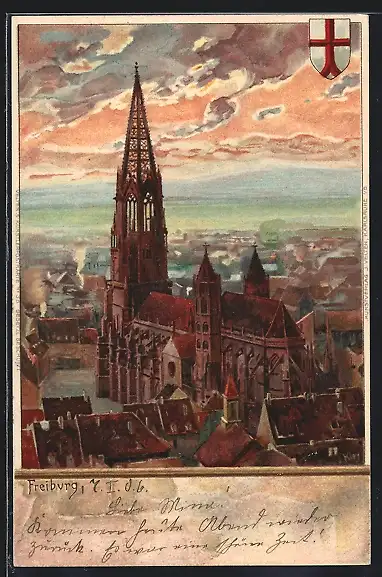 Künstler-AK Heinrich Kley: Freiburg, Blick über die Dächer mit Kirche, Wappen