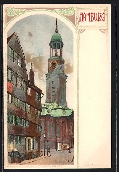 Künstler-AK Heinrich Kley: Hamburg, Strassenpartie mit Blick auf die Kirche