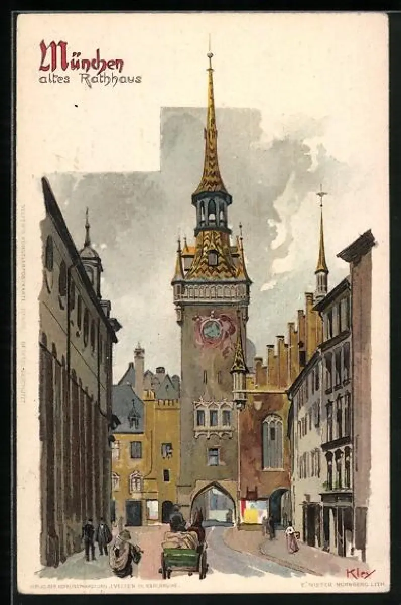 Künstler-AK Heinrich Kley: München, Rathaus mit Pferdewagen und Anwohnern