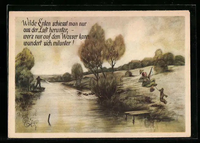 Künstler-AK Heinz Geilfus: Wilde Enten schiesst man nur..., Jäger mit Gewehr