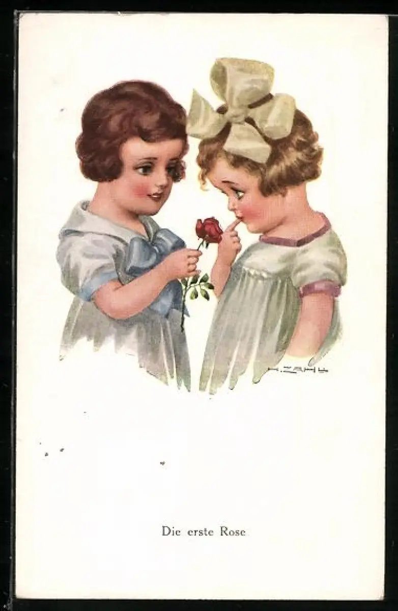 Künstler-AK Hela Peters: Mädchen schenkt seiner Freundin eine Rose