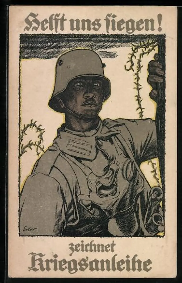 Künstler-AK Helft uns siegen! zeichnet Kriegsanleihe, Sturmsoldat im Angesicht der Gefahr