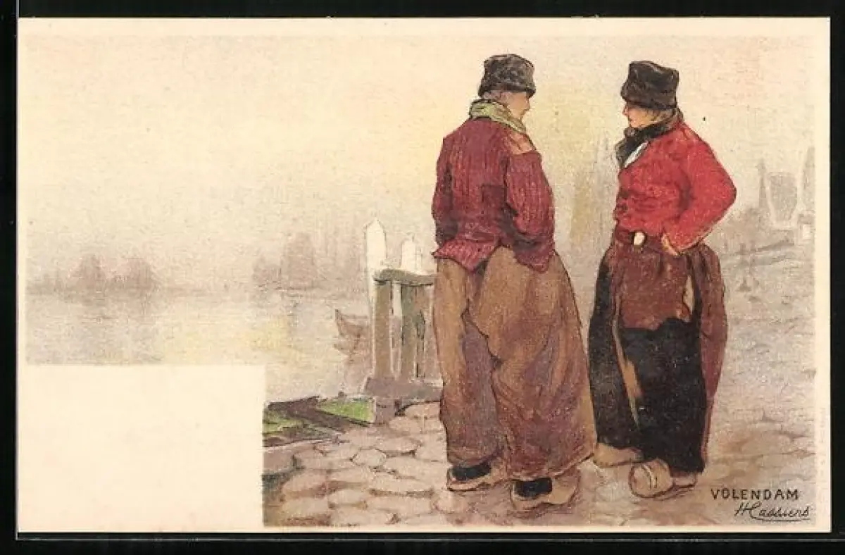 Künstler-AK Henri Cassiers: Volendam, Männer in Tracht am Hafen