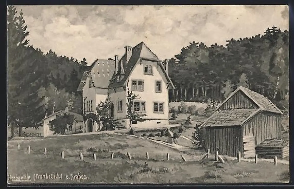 Künstler-AK Herbaville, Maison de campagne entourée de forêt et granges