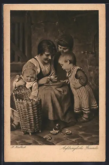 Künstler-AK Hermann Kaulbach: Aufdringliche Freunde, Frau schält Apfel, Kinder daneben