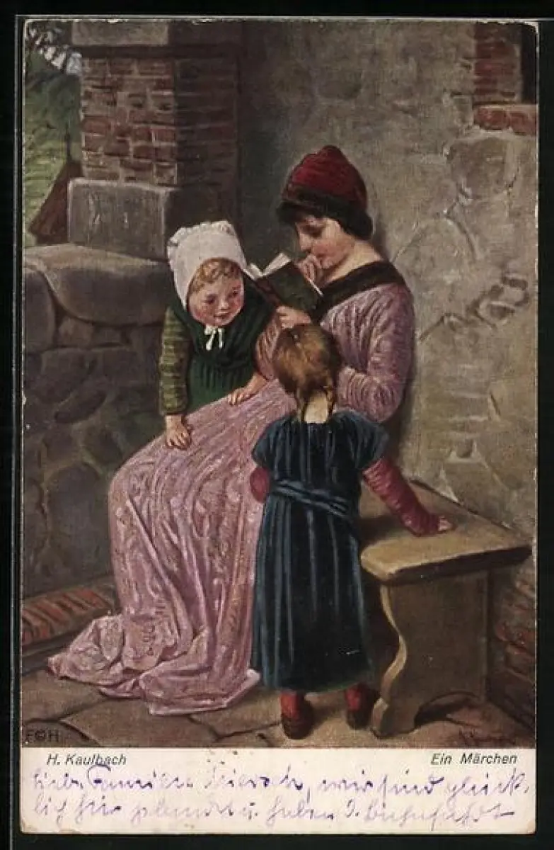 Künstler-AK Hermann Kaulbach: Ein Märchen, die Mutter liest den beiden Mädchen ein Märchen vor
