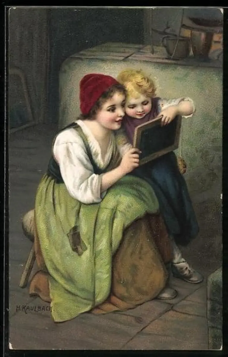 Künstler-AK Hermann Kaulbach: Frau mit Kind und Schultafel