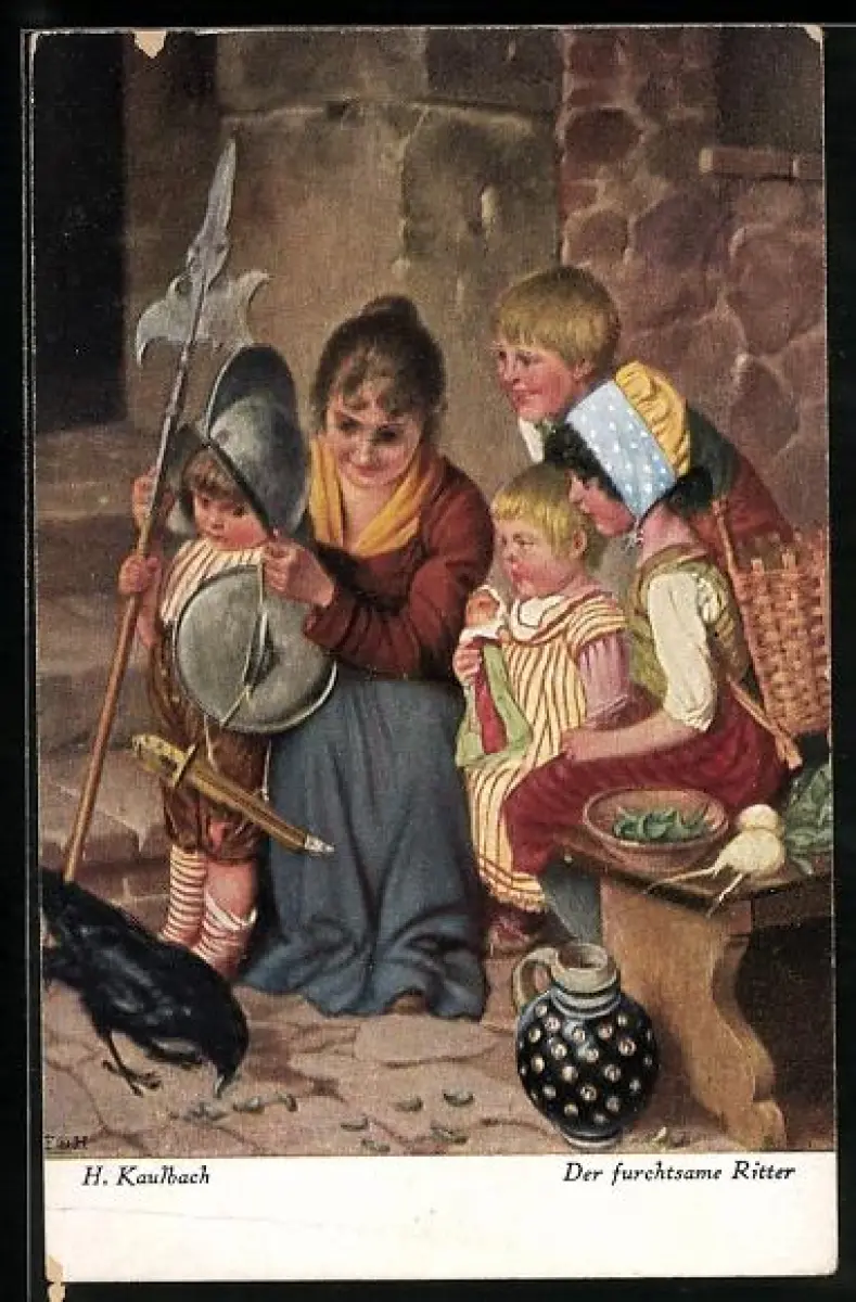 Künstler-AK Hermann Kaulbach: Kleiner Junge als Ritter verkleidet mit Mutter und Geschwistern blicken auf einen Raben