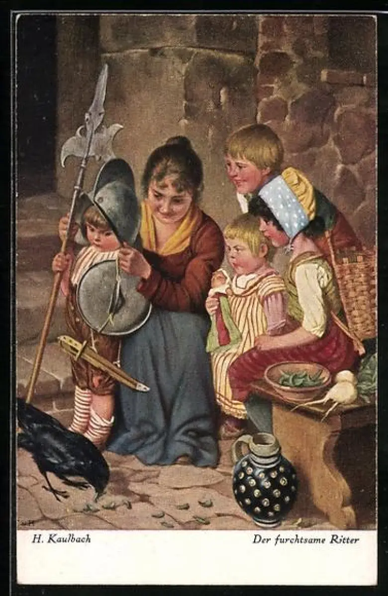 Künstler-AK Hermann Kaulbach: Kleiner Junge als Ritter verkleidet mit Mutter und Geschwistern blicken auf einen Raben