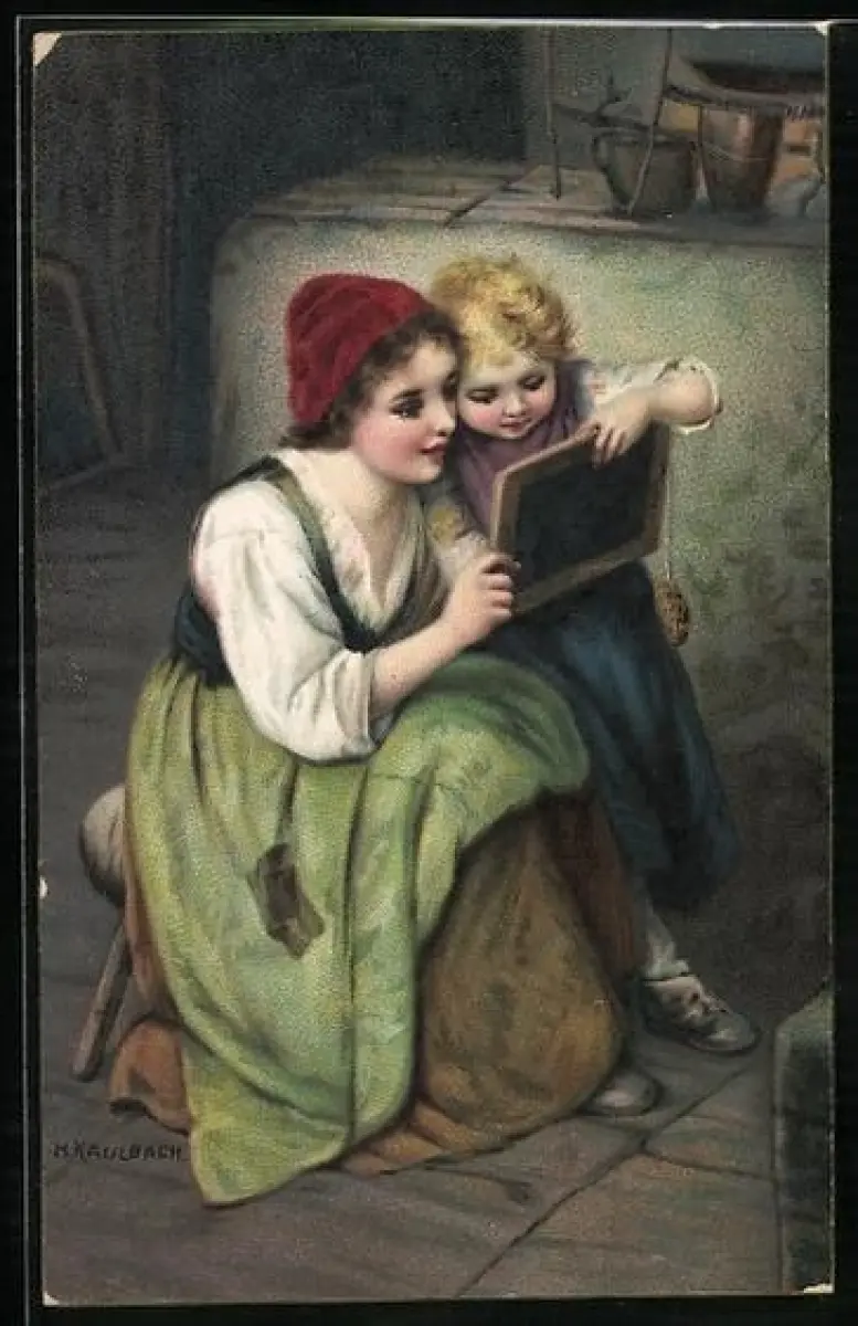 Künstler-AK Hermann Kaulbach: Mädchen mit Schiefertafel, Aller Anfang ist schwer