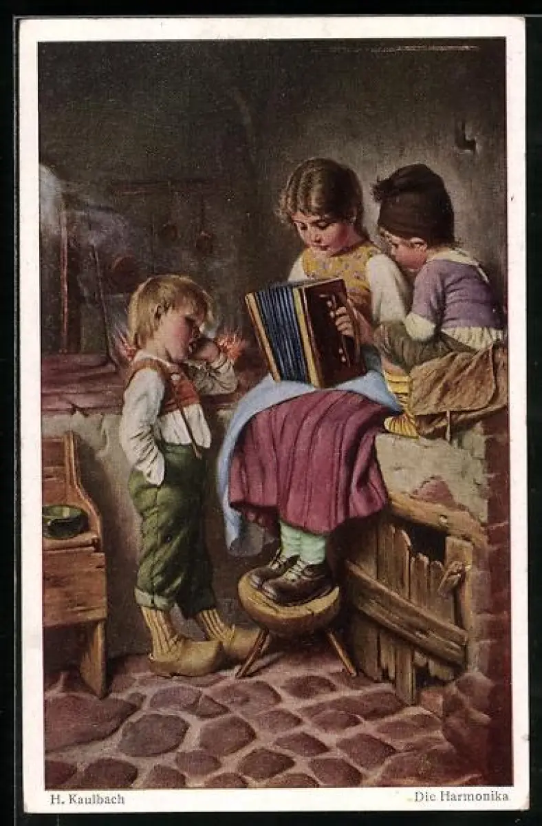 Künstler-AK Hermann Kaulbach: Mädchen spielt für ihre Freunde auf der Ziehharmonika
