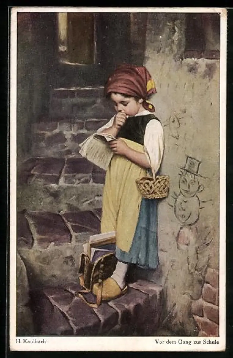Künstler-AK Hermann Kaulbach: Mädchen vor dem Gang zur Schule