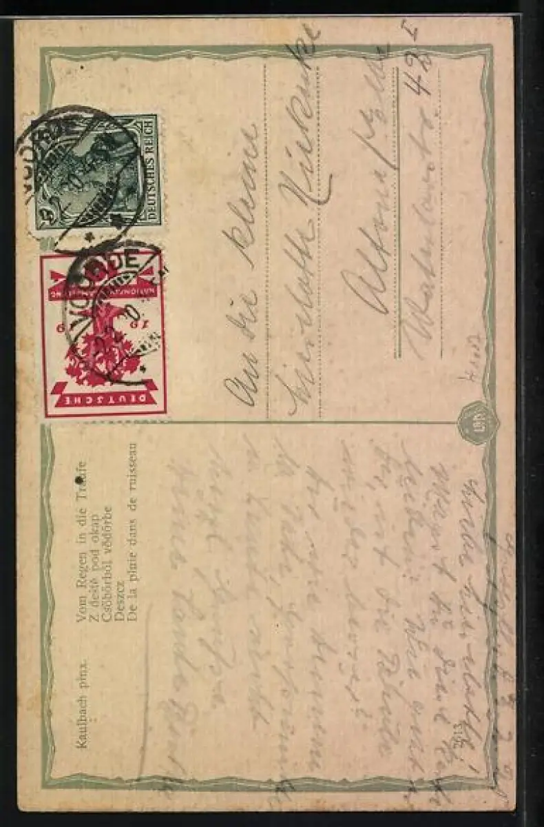 Künstler-AK Hermann Kaulbach: Vom Regen in die Traufe, Kinder mit Regenschirm laufen eine Treppe hinab