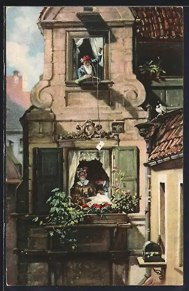 Künstler-AK Hermann Rüdisühli: Mann lässt Liebesbrief an einer Schnur herunter