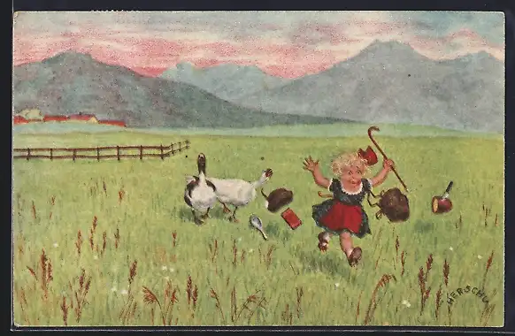Künstler-AK Herschu: Mädchen rennt vor zwei Gänsen davon