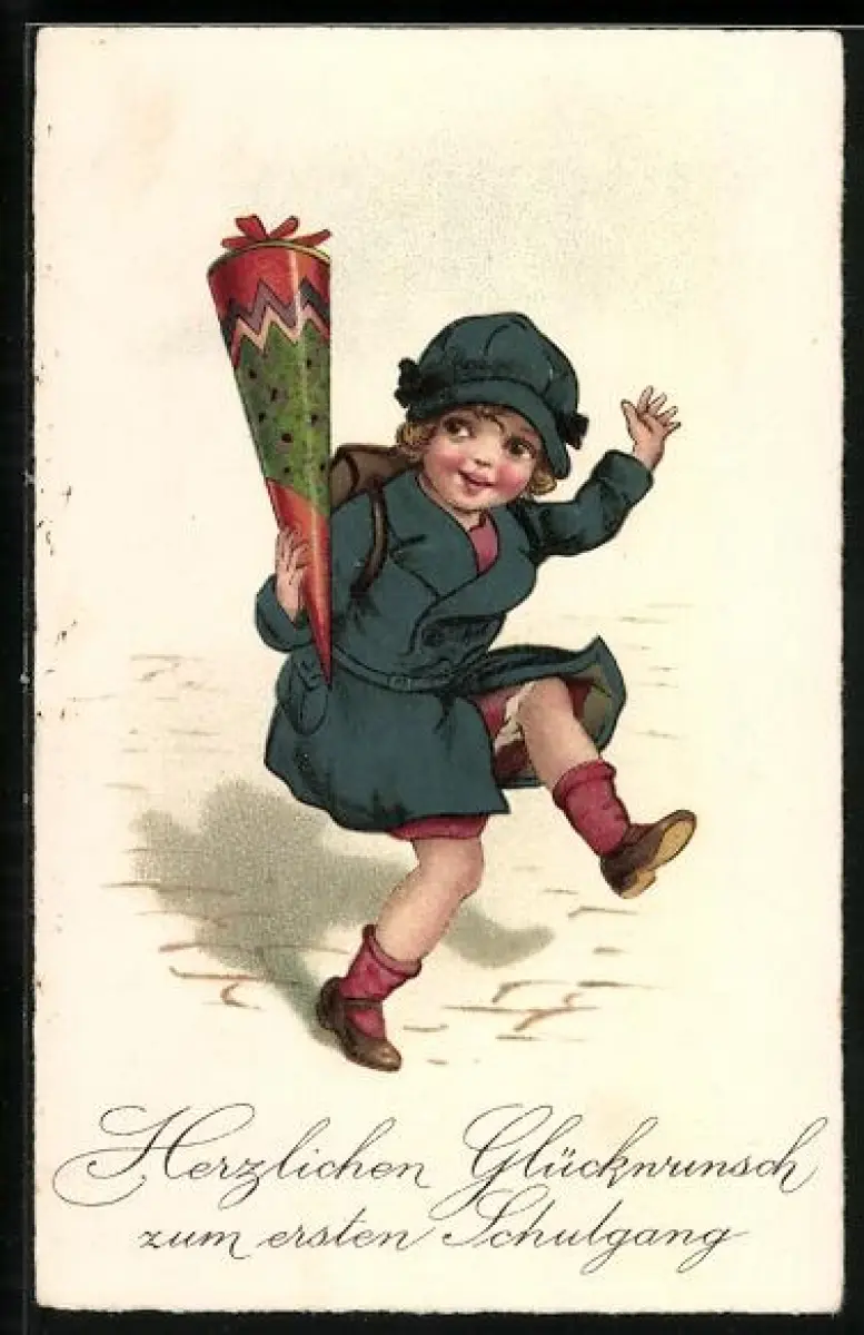 Künstler-AK Herzlichen Glückwunsch zum ersten Schulgang, Mädchen im blauen Mantel winkt mit Zuckertüte