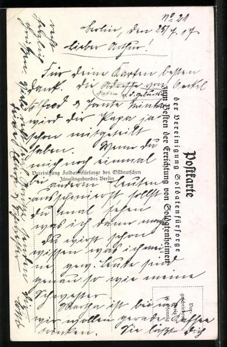 Personenbezogene Daten auf der Rückseite der Karte wurden durch blauen Textmarker unkenntlich gemacht. Die blauen Stellen sind auf die Vorderseite durchgeweicht und wirken sich negativ auf das Postkartenfoto aus