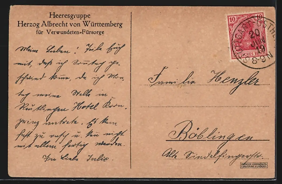 gelaufen 1919, Ecken bestoßen, guter Zustand