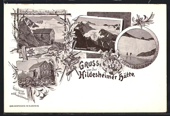 Künstler-AK Hildesheimer Hütte, Windach-Gletscher, Geisskogel, Ferner, Berghütte mit See