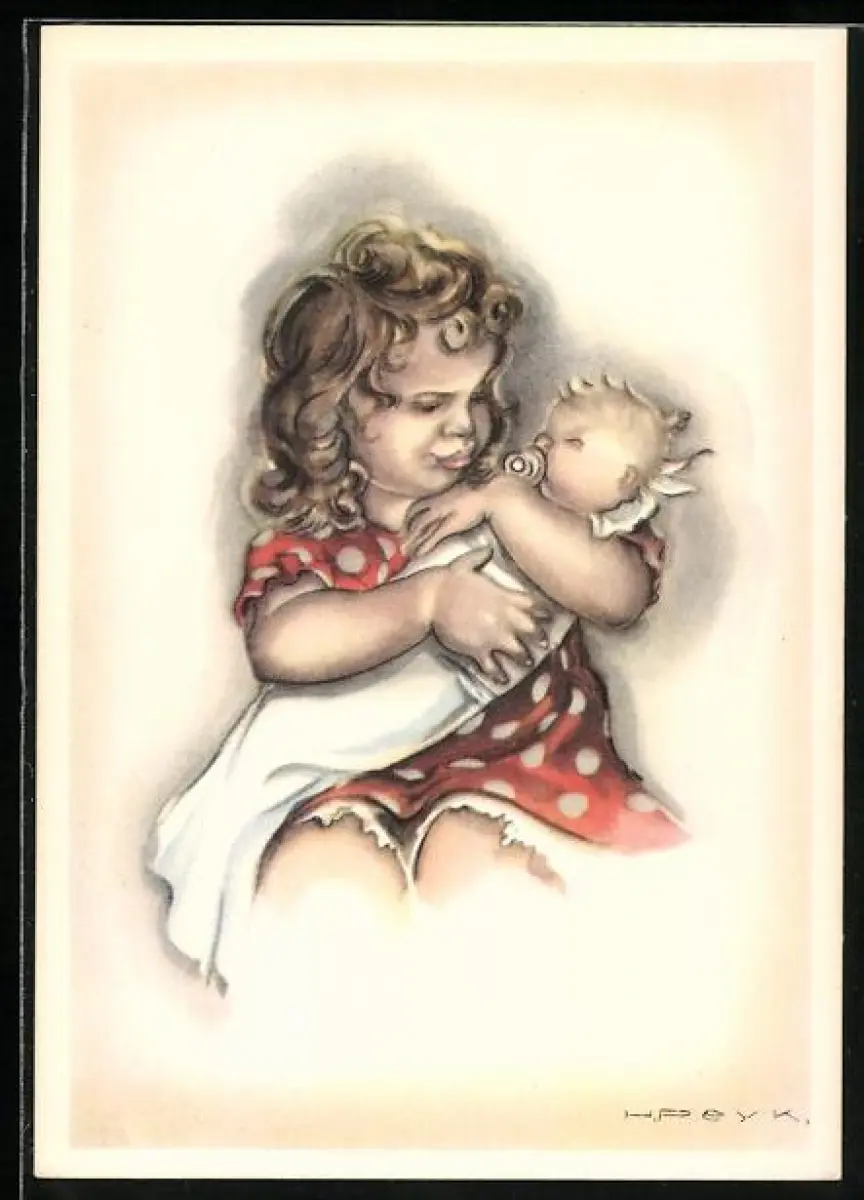 Künstler-AK Hilla Peyk: Schwester wiegt ihr Brüderchen in den Schlaf