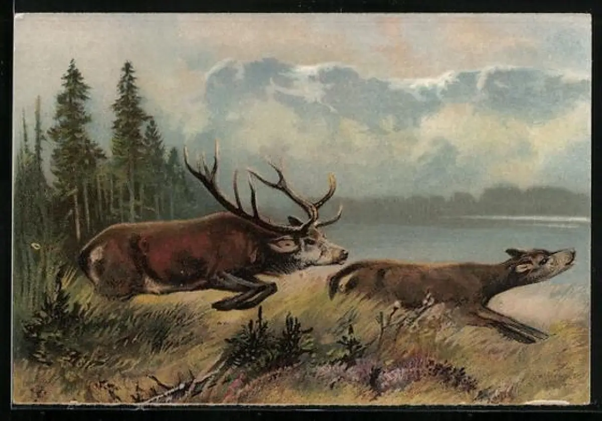 Künstler-AK Hirsch hetzt eine Hirschkuh