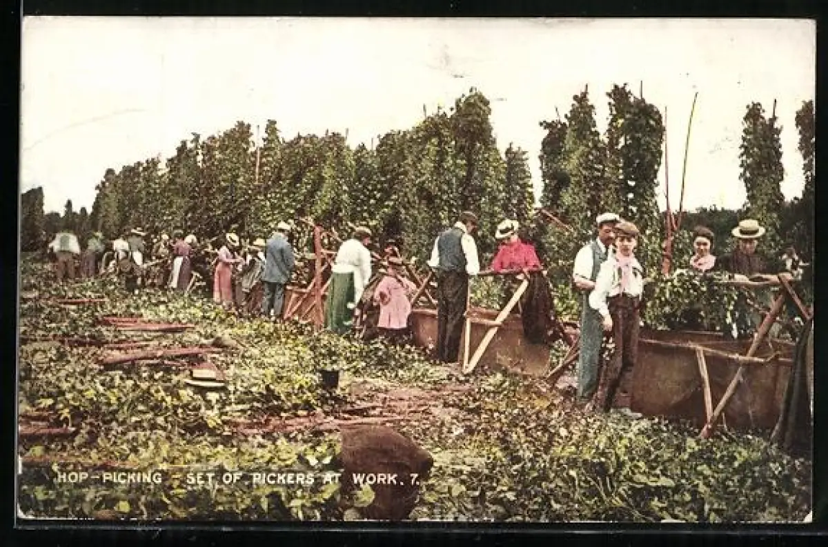 Künstler-AK Hop Picking, Set of Pickers at work, Bauern ernten Hopfen