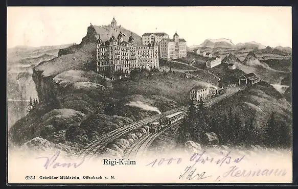 Künstler-AK Hotel Rigi-Kulm mit der Rigi-Bahn