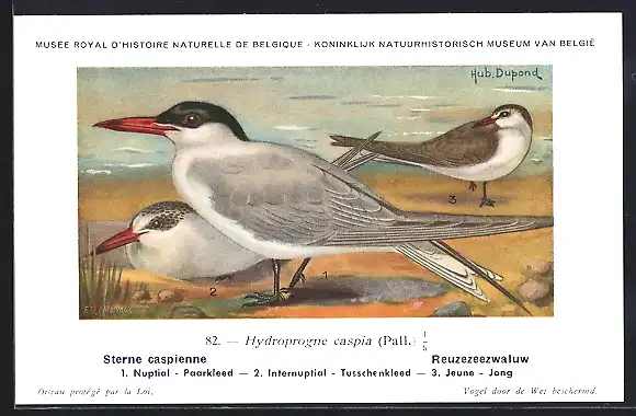 Künstler-AK Hubert Dupond: Sterne caspienne, Hydroprogne caspia, Nuptial, Internuptial, Jeune, Vögel