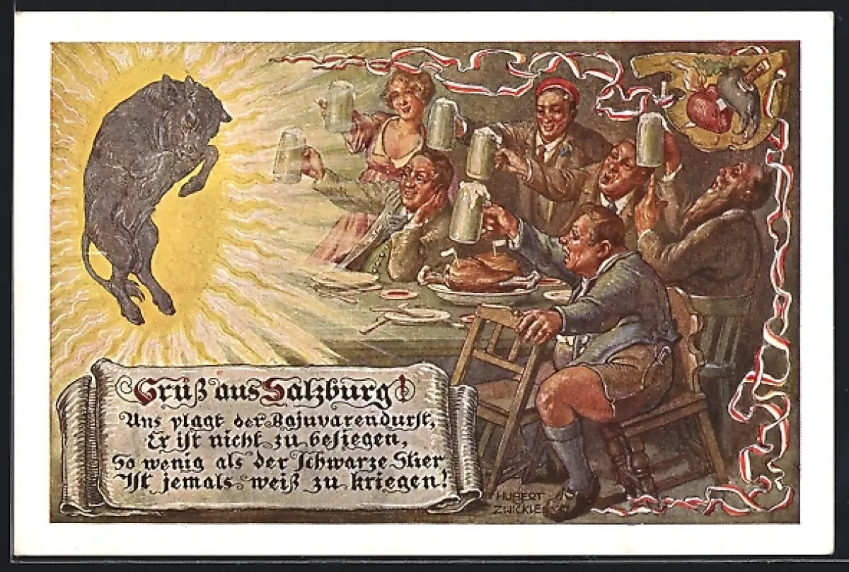 Künstler-AK Hubert von Zwickle: Salzburg, Erscheining eines Ochsen in der Kneipe