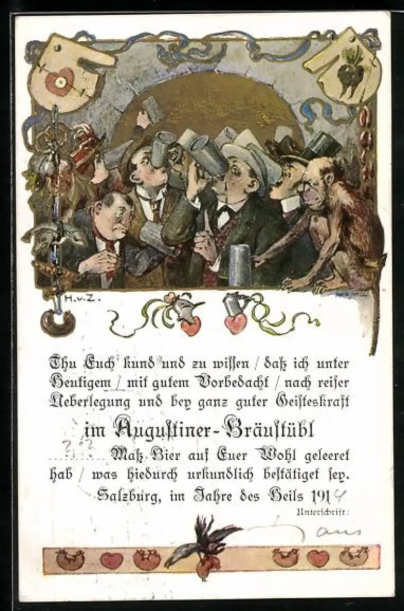 Künstler-AK Hubert von Zwickle: Trinkzertifikat, Salzburger Bierkarte