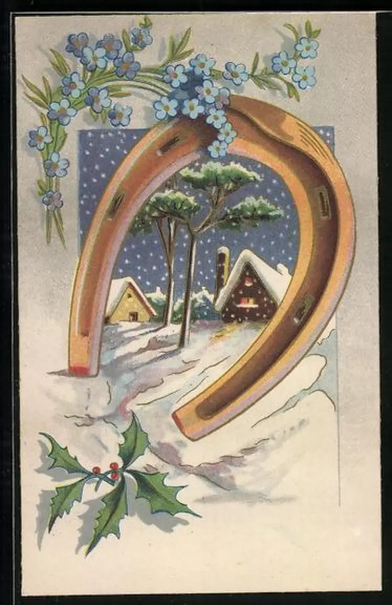 Künstler-AK Hufeisen vor einem verschneiten Dorf, Stechpalmenzweig