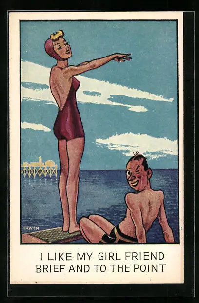 Künstler-AK I like my girlfriend brief and to the point, Frau steht auf einem Steg zum Sprung bereit, Mann in Badehose