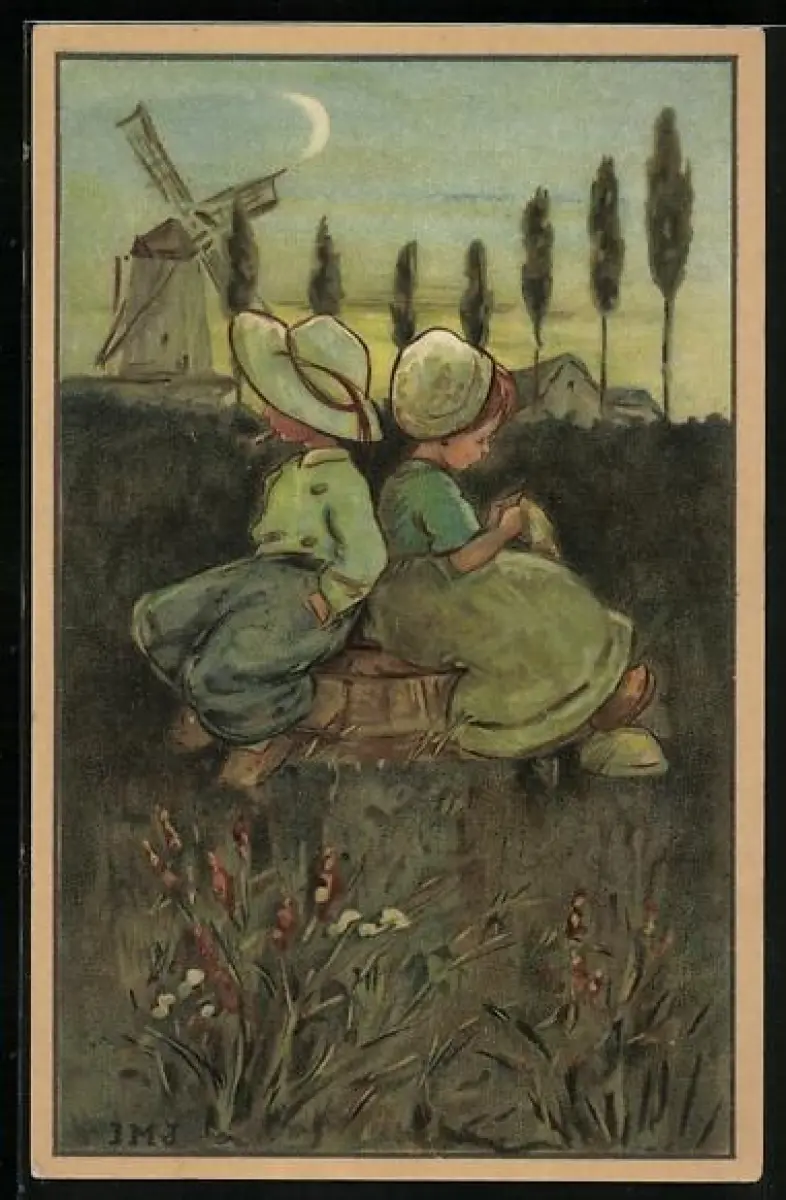 Künstler-AK I.M.J.: Kinder bei der Mühle