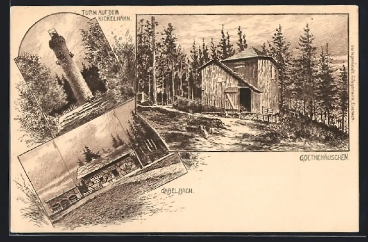 Künstler-AK Ilmenau, Goethehäuschen, Turm auf dem Kickelhahn, Gasthaus Gabelbach
