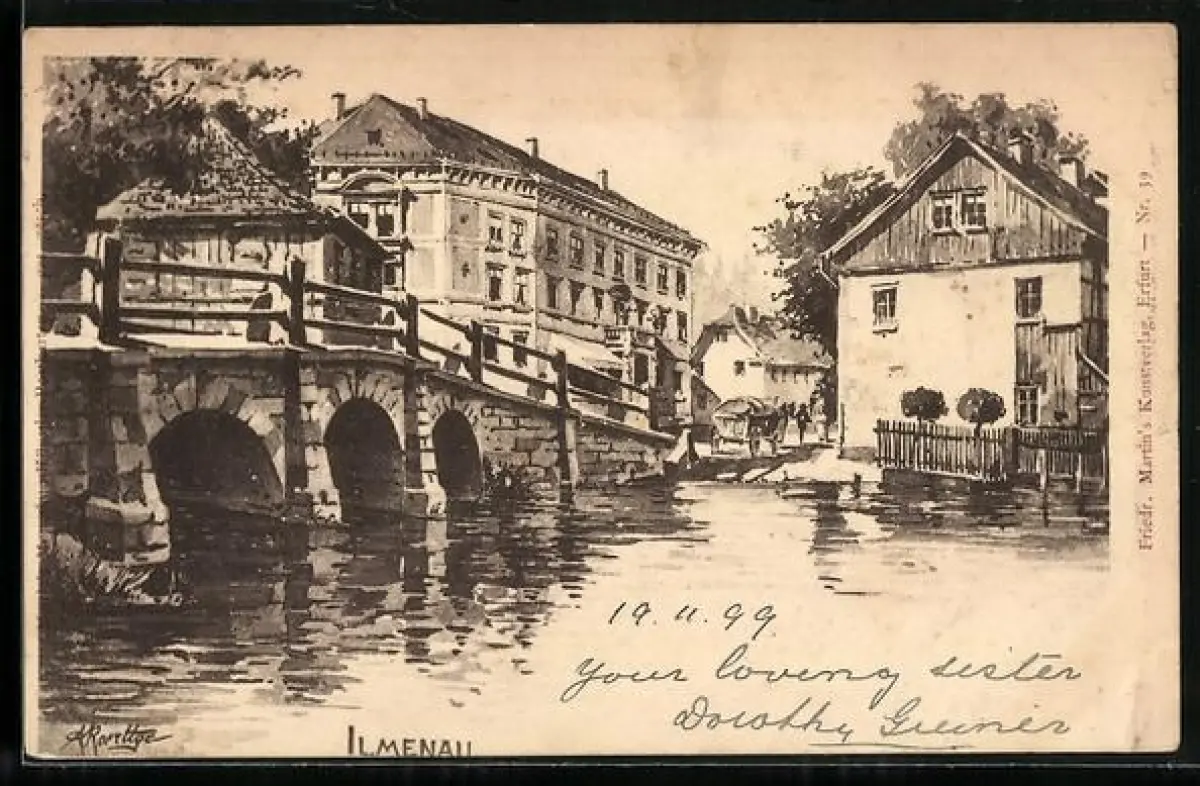 Künstler-AK Ilmenau / Thür., Wasserpartie mit Brücke