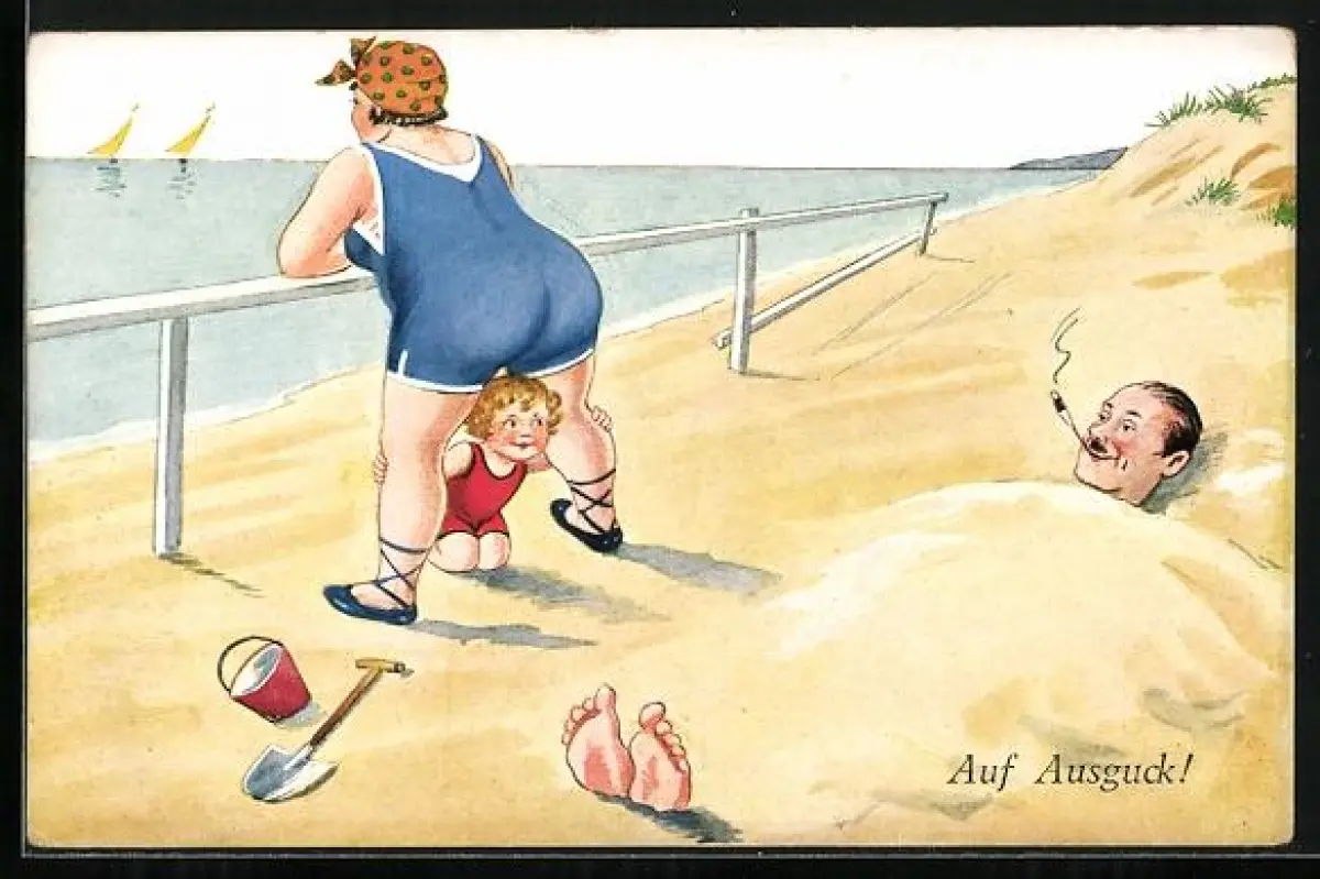 Künstler-AK In Sand eingegrabener Mann beobachtet eine Frau in Badeanzug
